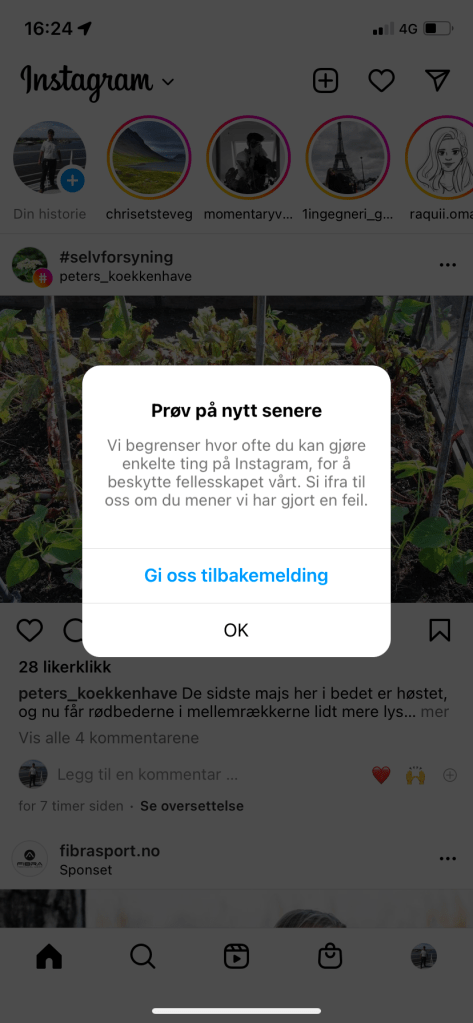 Opprettet konto nummer to på Instagram i dag, en halv time senere ble konto nummer to suspandert i 30 dager. Noen minutter senere fikk jeg en melding fra Instagram at min aktivitet på Instagram skulle begrenses for å beskytte felleskapet.