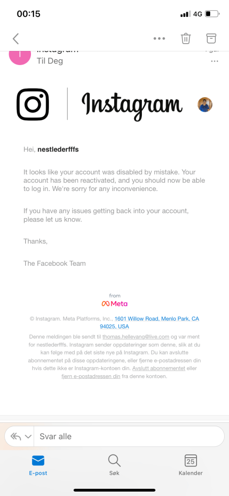 Fikk melding fra Instagram at kontoen min var stengt ved ein feiltagelse.