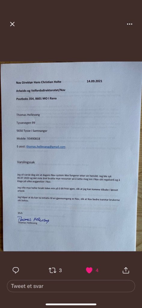 Brev sendt til Nav Direktør Anne Kverneland Bogsnes, Nav Vestland og Nav direktør Hans Christian Holte.