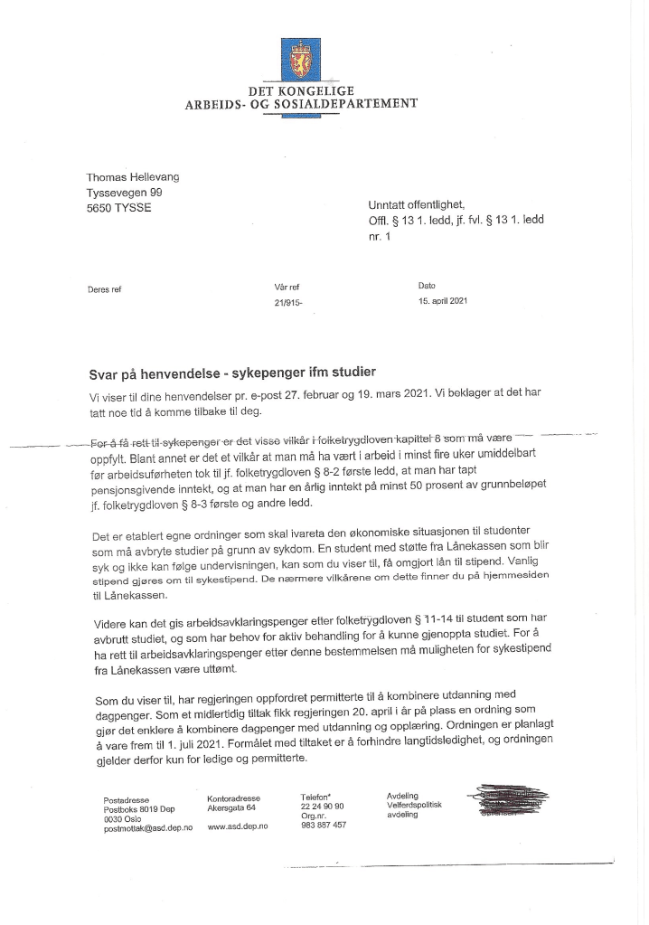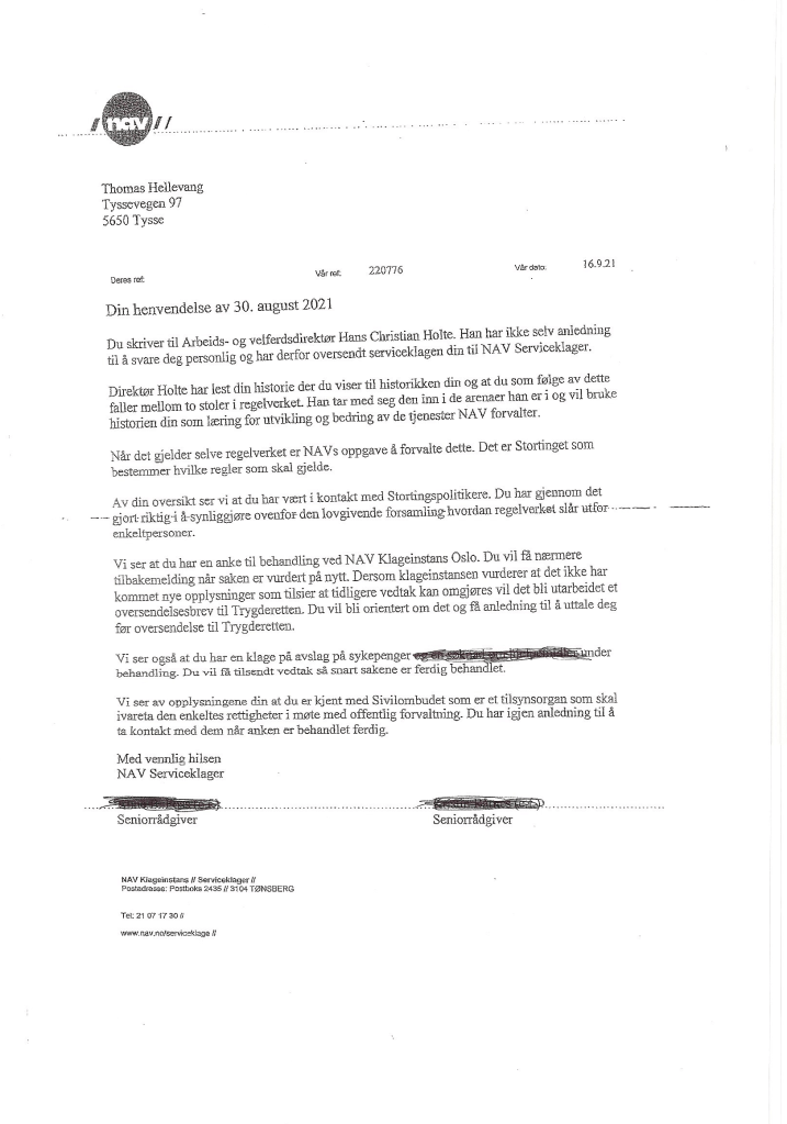 Sendte brev til deg Hans Christian Holte 24 april. Jeg fikk svar fra arbeids-og sosialminister Torbjørn Røe Isaksen.