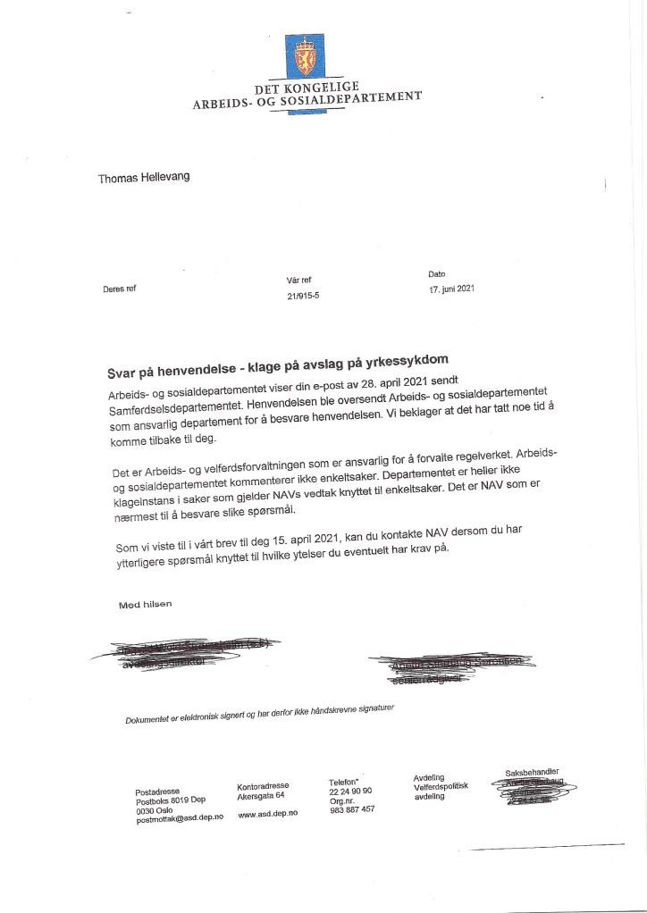 Tilslutt svarte han. Det tok mange måneder før han svarte meg. Jeg har også tatt med to brev fra Arbeids-og sosial departementet.